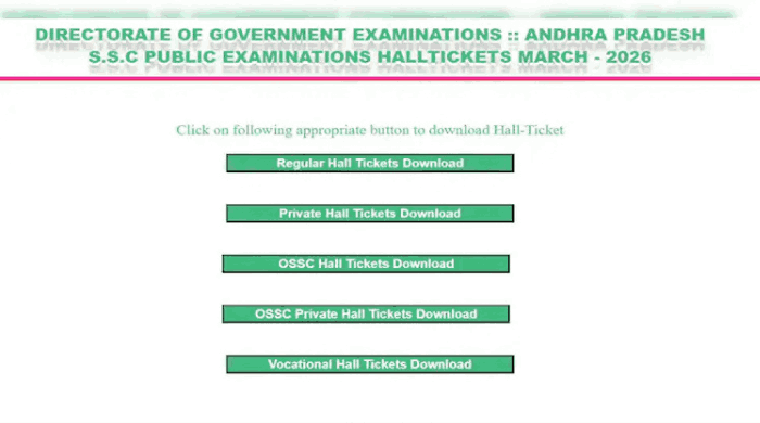 ఆంధ్రప్రదేశ్లో 10వ తరగతి పబ్లిక్ పరీక్షలకు సంబంధించిన హాల్ టికెట్లు ఈ వారం విడుదలయ్యే అవకాశం ఉంది. ఆంధ్రప్రదేశ్ విద్యాశాఖకు చెందిన బోర్డ్ ఆఫ్ సెకండరీ ఎడ్యుకేషన్ ప్రకారం మార్చి 16 నుంచి ప్రారంభమయ్యే SSC పరీక్షలకు హాల్ టికెట్లు అధికారిక వెబ్సైట్ bse.ap.gov.in ద్వారా అందుబాటులో ఉంటాయి. అదే కాకుండా మన మిత్ర వాట్సాప్ సేవ (9552300009) మరియు స్కూల్ ఎడ్యుకేషన్ డిపార్ట్మెంట్ యొక్క లీపు మొబైల్ యాప్ ద్వారా కూడా హాల్ టికెట్లు పొందవచ్చు. మార్చి 2న కొద్దిసేపు హాల్ టికెట్ లింక్ యాక్టివ్ అయ్యింది కానీ తరువాత నిలిపివేశారు. త్వరలో మళ్లీ డౌన్లోడ్ సౌకర్యం అందుబాటులోకి రానుంది. విద్యార్థులు పరీక్షల ముందు హాల్ టికెట్ తప్పనిసరిగా పొందాలని